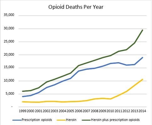 If you examine the chart more closely, you can see that between 1999 and 2011, prescription opioid deaths (blue line) went up and up, from 4,041 in 1999 to 18,893 in 2014, an increase of over 450%.